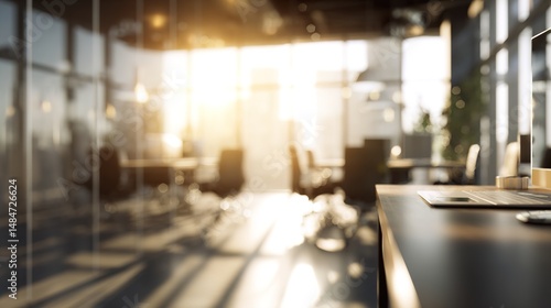 Modern business office setting environment blurred background with sunlight reflection on window glass for design. High quality
