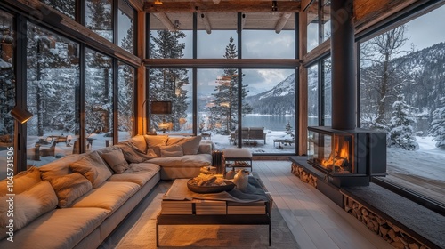 Modern Cabin Interior With Cozy Fireplace and Stunning Winter Lake View