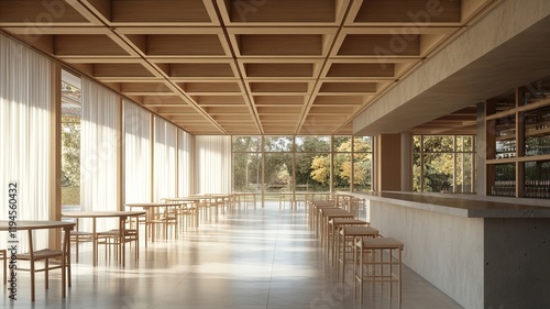 Modern cafe interior, sunlit, autumn garden view