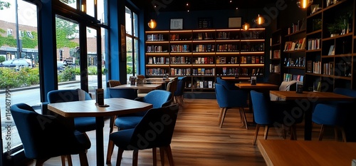 Modern cafe interior with bookshelves, wooden tables, and blue chairs near large windows.