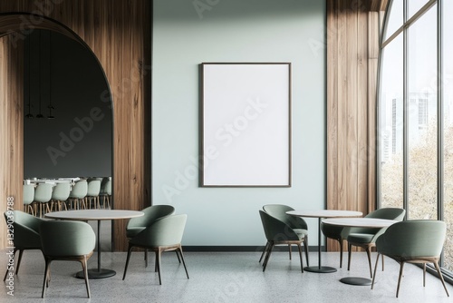 Modern cafe interior with green chairs, wooden walls, and large window.