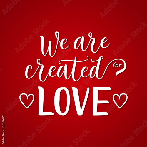 Modern calligraphy lettering of We are created for love in white on red gradient background decorated with hearts for decoration, poster, banner, valentine, valentines day, sticker, postcard