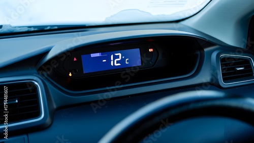 Modern Car Dashboard Display Showing Minus Twelve Degrees Celsius in Cold Winter Weather
