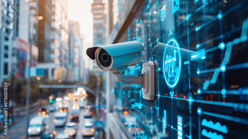Modern CCTV camera on a wall. A blurred background with an abstract infographics and security HUD. Toned image double exposure mock up
