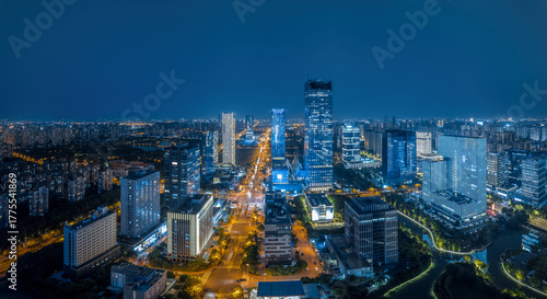Modern city commercial financial district skyline with illuminated skyscrapers at night in Suzhou.
