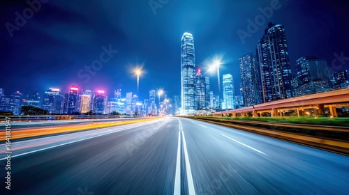 Modern Cityscape at Night: Dynamic Road Perspective with Illuminated Skyscrapers and Vibrant Urban Ambiance
