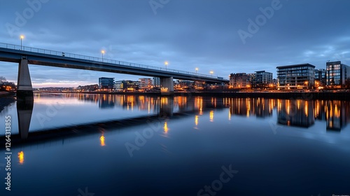 Modern Cityscape At Night With River Reflections And Illuminated Bridge