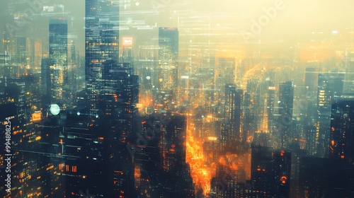 Modern cityscape network icons double exposure.