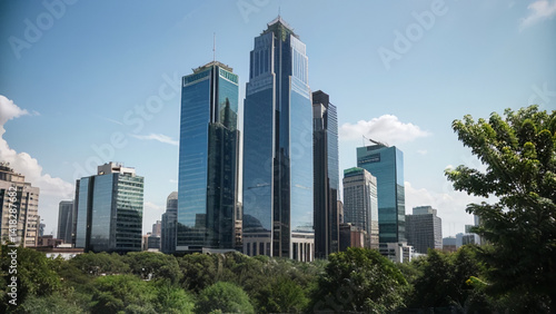 Modern Cityscape with Gleaming Skyscrapers and Lush Green Trees