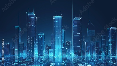 Modern Cityscape with Skyscrapers and Glass Buildings in Blue Shades Symbolizing Innovation and Technology. Representation of Digital Transformation in Real Estate