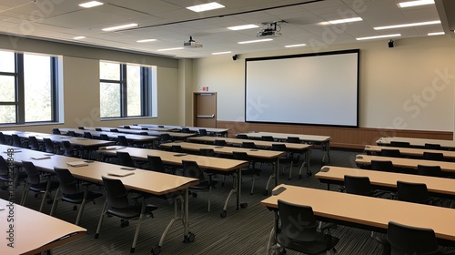 Modern Classroom Interior with Desks and Projector Screen