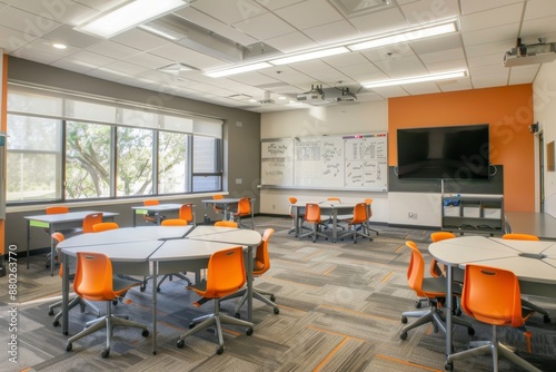 Modern Classroom with Orange Chairs and a Whiteboard
