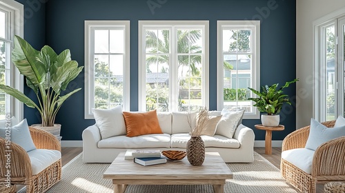 Modern Coastal Living Room with Navy Walls, Comfortable Seating, and Bright, Fresh Aesthetic