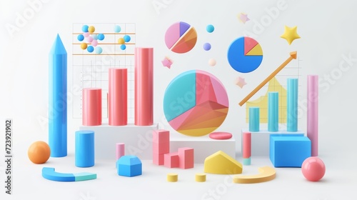 Modern colorful 3D infographics. Statistics Business 3d Pie Chart, Bars, Strips, Steps and Options. Business Infographic creative design made of 3D shapes