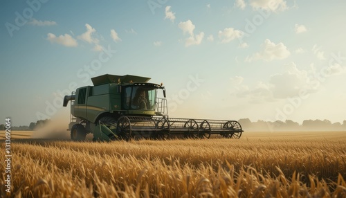 Modern Combine Harvester Working in Golden Wheat Field at Sunset