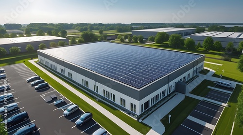 Modern commercial building equipped with rooftop solar panels in a clean industrial park, representing sustainable energy, innovation, and eco-friendly architecture in business