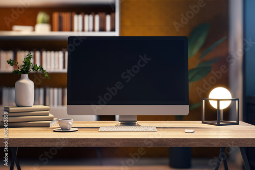 Modern computer monitor on a wooden desk with books, decorative plant, and lamp, depicting a cozy office workspace against a bookshelf background. 3D Rendering