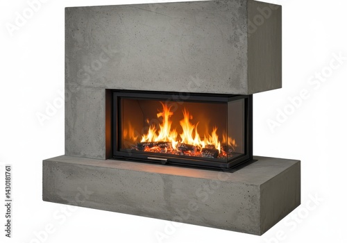 Modern concrete fireplace with burning fire and black frame against a white background indoors home decor