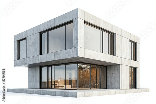 Modern concrete house with large windows, isolated on white