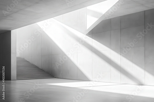 Modern concrete interior with dramatic light shafts.