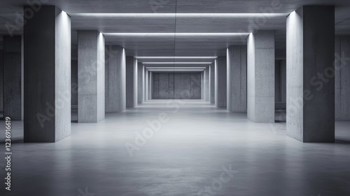 Modern concrete underground parking garage with illuminated columns and empty space for vehicles