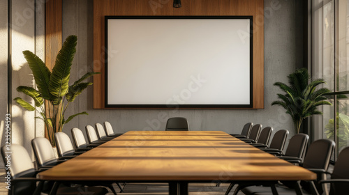 Modern Conference Room – Sleek Wooden Table, Ergonomic Chairs & Presentation Screen