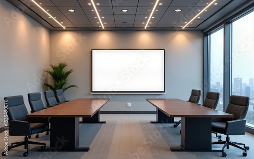 Modern conference room setup with seating and presentation area. High quality