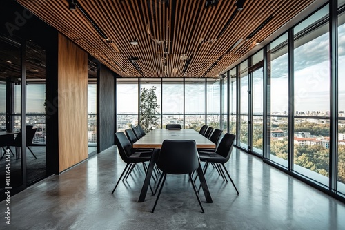 Modern conference room with a large window overlooking a city skyline.