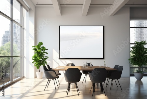 Modern conference room with empty poster and city view.