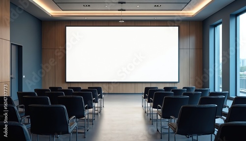 Modern conference room with empty seats facing a large blank screen. Featuring sleek wood paneling and blue walls, this minimalist venue suits business meetings, presentations, or training sessions.
