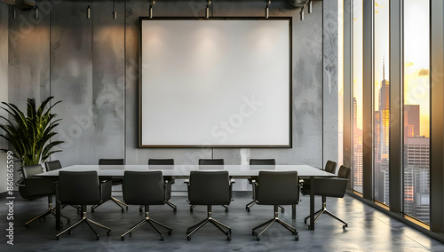 Modern conference room with large blank canvas on wall, overlooking city skyline. Photo ideal for presentation or business meeting mockup.
