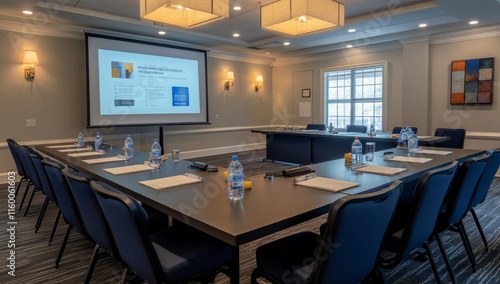 Modern conference room with large u-shaped table, projector screen, and presentation.