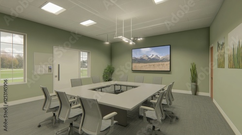 Modern conference room with mountain view presentation