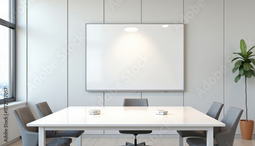 Modern conference table mockup in bright office with blank whiteboard and minimalist design for copy space