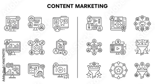 Modern content marketing strategy and digital promotion outline icons showcasing online engagement, analytics, and creative content creation concepts