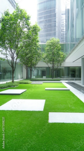 Modern courtyard with green grass, stone, trees, and building reflections in glass