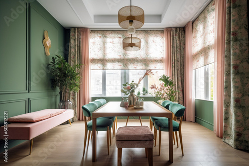 Modern cozy dining room, classic interior design with pastel colors. Super photo realistic background, generative ai illustration