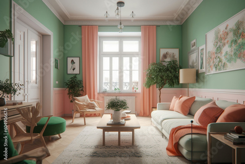 Modern cozy living room, classic interior design with light coral, green and white colors. Super photo realistic background, generative ai illustration