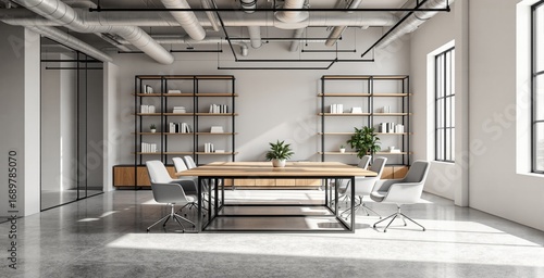 Modern creative office interior with industrial design concept and minimalist furniture in a bright, sunlit workspace with open shelving and plants. Ai generative