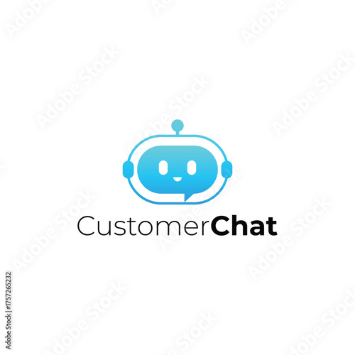 Modern customer chat logo combining chat bubble, headphone, and robot elements. Perfect for customer service, support app, technology brand, or AI communication design.