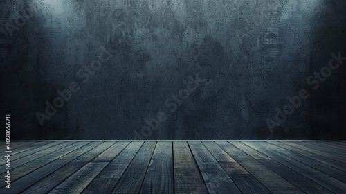 Modern dark gray wall and wooden floor background with copy space. Night background of a modern gray wall.
