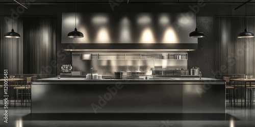 Modern Dark Kitchen Interior Design: Sleek Stainless Steel Countertop and Industrial Lighting