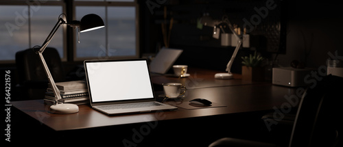 Modern dark office at night with laptop mockup, light from table lamp, and office accessories