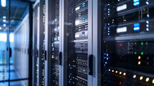 Modern Data Center with Black and White Server Cabinets, Illuminated by Soft Lighting and Large Glass Windows