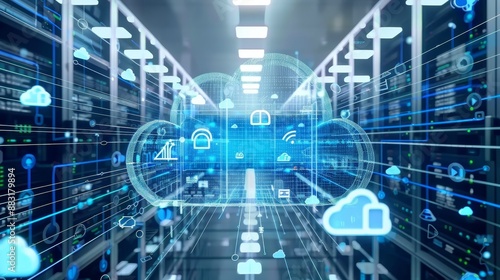 Modern data center with holographic cloud computing technology and blue neon lights. Concept of data storage and network infrastructure.
