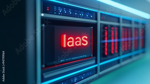Modern data center with IaaS technology, showcasing illuminated server rack for cloud infrastructure service.