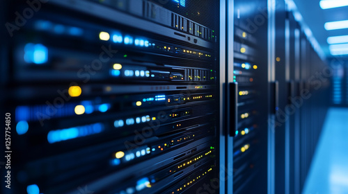 Modern data center with illuminated server racks, ideal for technology, cloud computing, and cybersecurity concepts