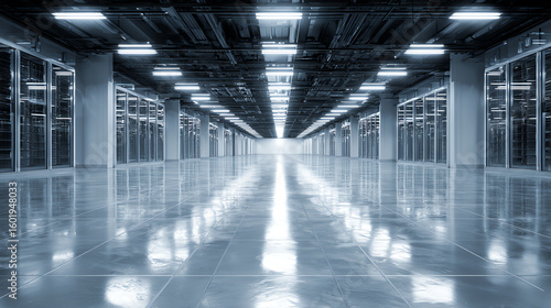 Modern data center with sleek design, illuminated by overhead lights, showcasing rows of servers in a spacious environment.