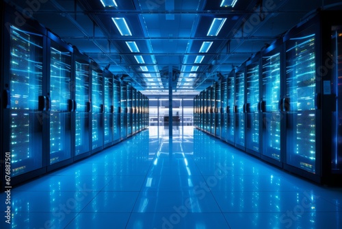 Modern data center with state of the art server racks emitting a captivating blue glow