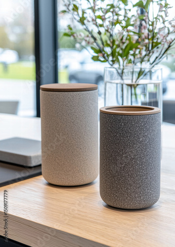 Modern decorative vases in neutral colors, showcasing minimalist design on wooden table, enhance serene atmosphere